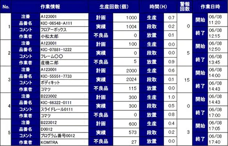 Since current “product number” and “operator name” are displayed, you can see not only operation status of the machines but also attendance of workers.